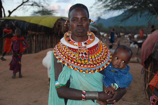 (cloth wrapped around like a skirt) enhanced with many colorful beaded necklaces, earrings, and bracelets.