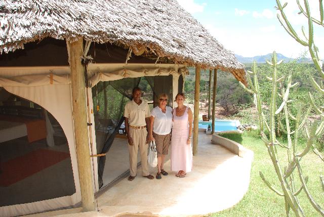 | We were escorted to our luxury tent at Sasaab by one of the managers (Ali, on the right). This amazing tent has a zip-door, but a thatched roof covers it and protects it. There is a Samburu spear next to the post on the left -- when you move that to a spot by your footpath it means "Do Not Disturb"> |