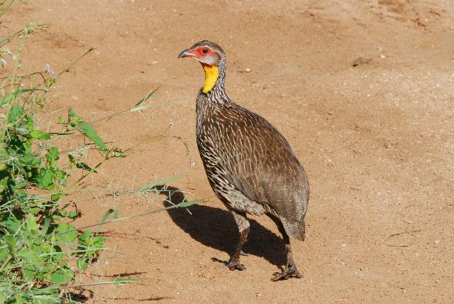 This common, distinctive and noisy bird is the Yellow-necked Spurfowl. Sometimes called a Francolin. They feed on insects, plants, and seeds.