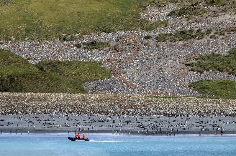 | One of our Zodiacs scouts the beach for a landing area. Now you can see quite a few penguins, eh? The adults are black, white and gray. The groups and streaks of brown are the youngsters. Many seals are stretched out on the beach in the foreground. We can't wait to get ashore! |