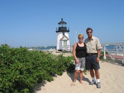Here we are at the Brant Point lighthouse -- Located on Nantucket Island, this is America's second oldest lighthouse location. A lighthouse has been at this spot since 1746. The current tower, standing only 26 feet high, was constructed in 1901. The light is still active, sending a red flash ten miles out to sea. |