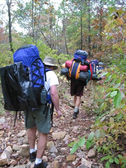 Out on the trail with our loaded packs. Note how rocky the Ouachita trail is -- with a heavy load, extra care is needed to avoid turning an ankle.