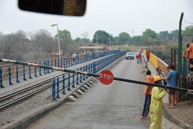 This is the Victoria Falls Bridge which forms the border between Zambia and Zimbabwe (formerly Northern and Southern Rhodesia, respectively). The rail line on the left is for freight only. One lane carries alternating traffic across, and it is not unusual to see a huge lineup of trucks on both sides as they jockey to clear customs. Pedestrians may cross on either side. |