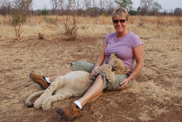 Pam sat down and one of the cubs (about 4 months old) came right over and crawled in her lap, put her head down and took a nap. Pam thought it was adorable the way she rested her immense paw on her leg.