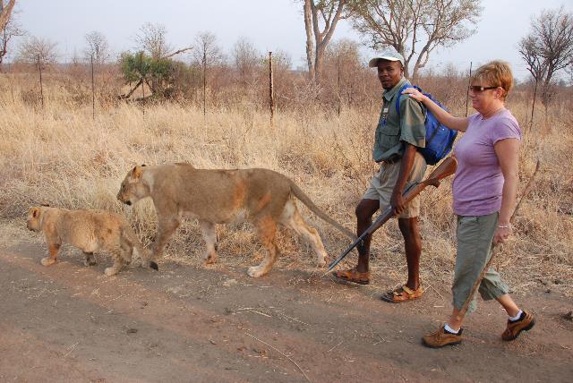 They did give each of us a stick, ostensibly to poke the lions in the eye if they started to get in our face. Pam decided it was better to hang close to one of the guides who carried a rifle (with live rounds) instead of relying on her stick. After a while, she got more comfortable with the idea of being around these amazing animals. |