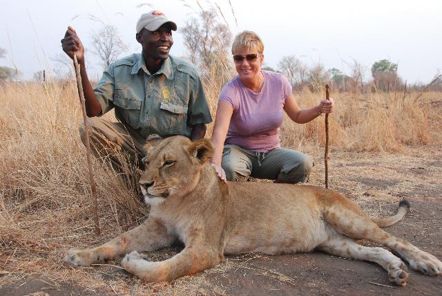 Gaining some courage, Pam went closer and actually petted this 160 pound 19-month old lioness. She was still staying close to the guide, though.