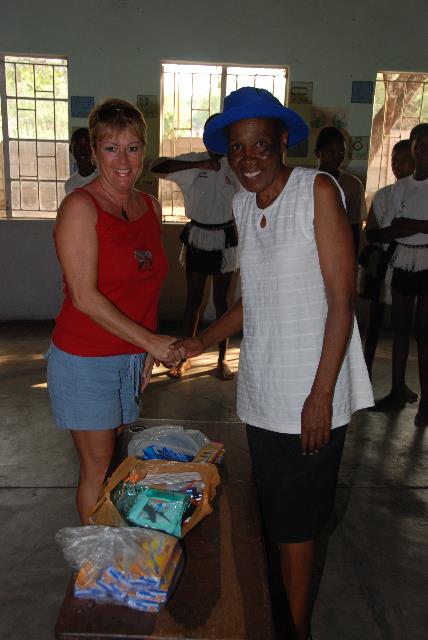 Pam shakes hands with one of the teachers at Chinotimba. She has been teaching here for more than 20 years! Pam presented her with some paints, pens and pencils to use in her classroom, and they were well received.