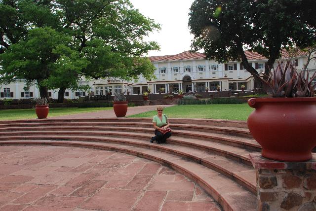Pam on the patio out behind Stanley's Terrace at the Victoria Falls Hotel. It's so peaceful here, you forget you're in Zimbabwe.